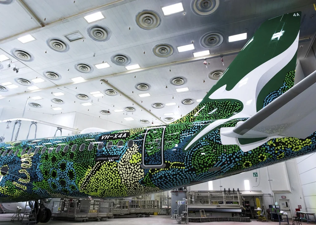 O novo A220, leva uma pintura especial única baseada em uma obra de arte aborígene, é o primeiro de uma frota de 29 aeronaves encomendadas pela Qantas Group. Este avião partirá da linha de montagem final da Airbus em Mirabel nos próximos dias para um voo de entrega até Sydney, com escalas em Vancouver, Honolulu e Nadi.