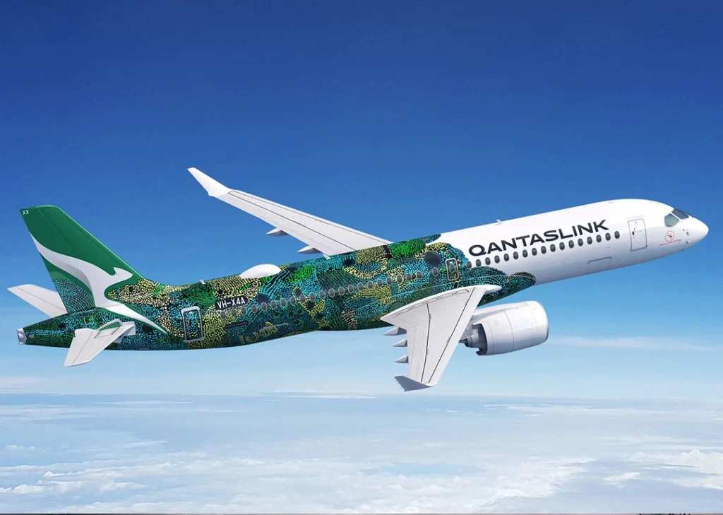 QantasLink, Airbus A220, aviação regional, eficiência de combustível, sustentabilidade, transporte aéreo, arte aborígene, modernização da frota.