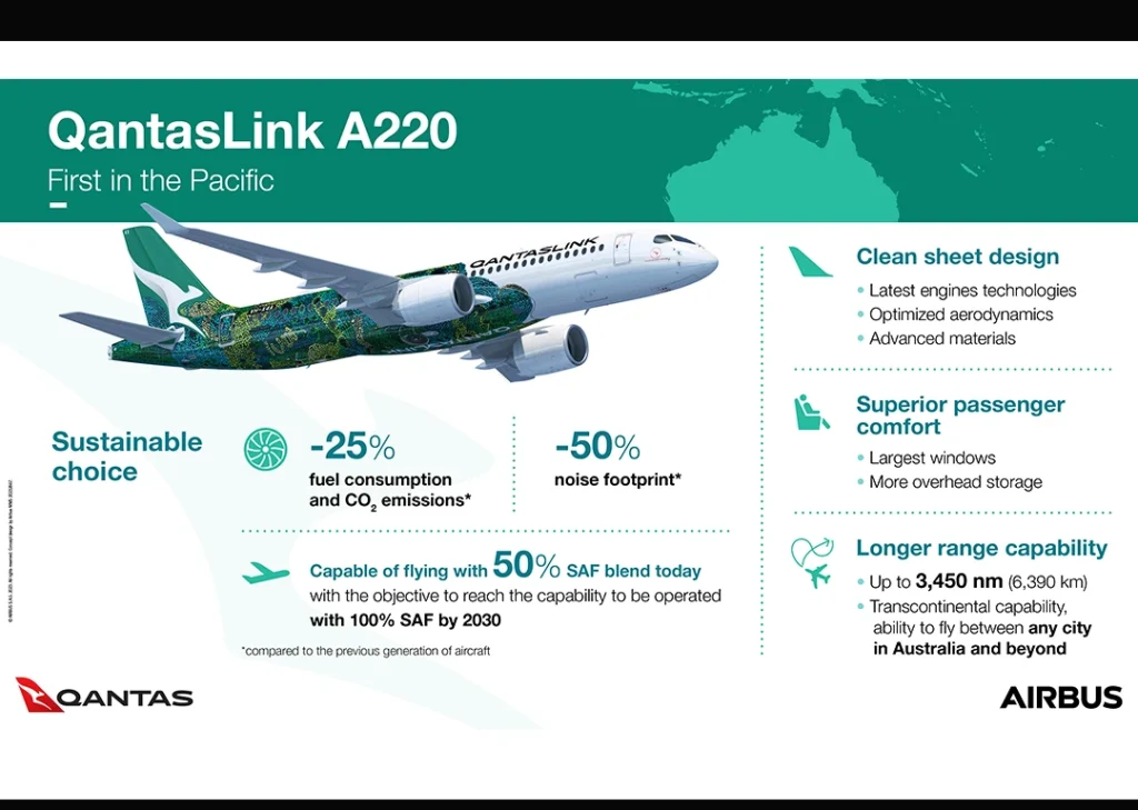 O A220 substituirá gradualmente a atual frota do modelo Boeing 717 da QantasLink, proporcionando uma capacidade de voo, onde será possível dobrar da distância percorrida. Com a possibilidade de conectar dois pontos na Austrália sem escalas, o A220 também oferece uma redução significativa de 25% no consumo de combustível e emissões de carbono em comparação com aeronaves de gerações anteriores.
